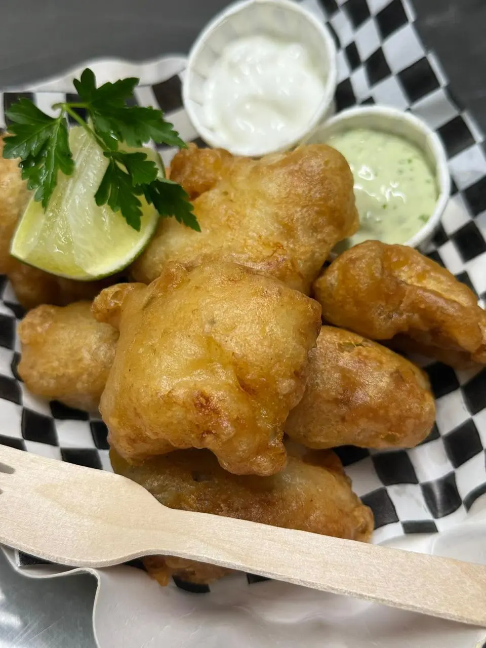 Crujientes y doraditas calugas de pescado, acompañadas de un delicioso agregado que realza su sabor en cada bocado. Perfectas para compartir o disfrutar como plato principal, frescas y listas para comer.